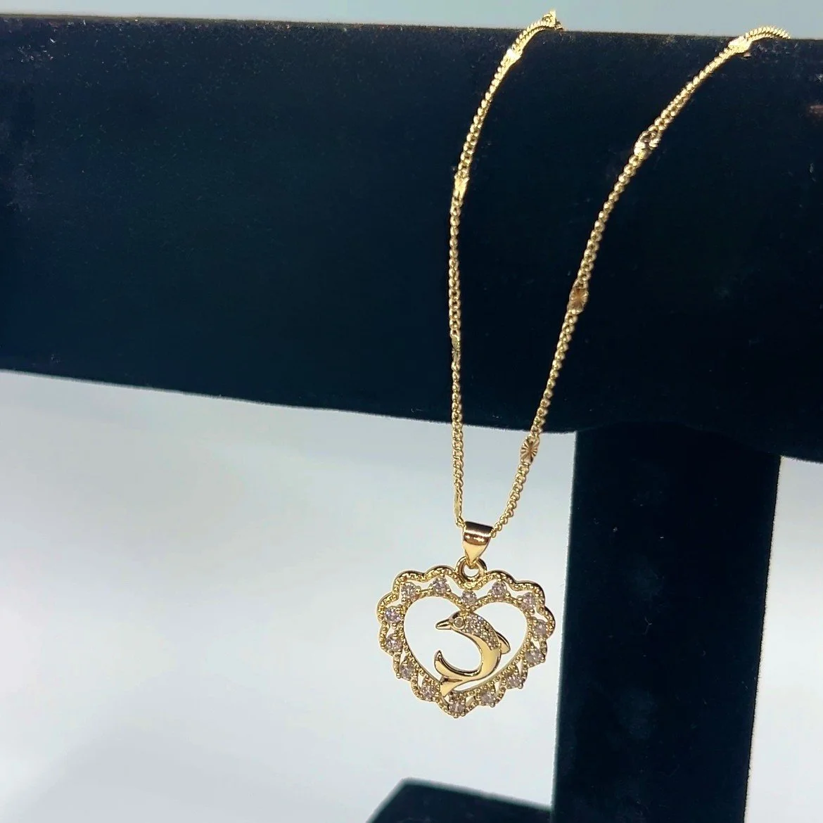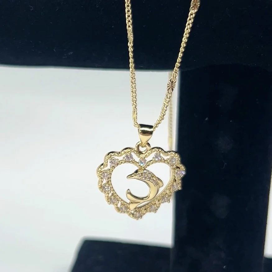 Shop › Dolphin Heart Charm Necklace Image 1 of 2 Image 2 of 2 Dolphin Heart Charm Necklace $45.00 14K Gold Plated Chain With Dolphin Heart Stone CharmLength: 17 in.Material: Gold Plated Stainless Steel Add To Cart Added! 14K Gold Plated Chain With Dolphin Heart Stone CharmLength: 17 in.Material: Gold Plated Stainless Steel